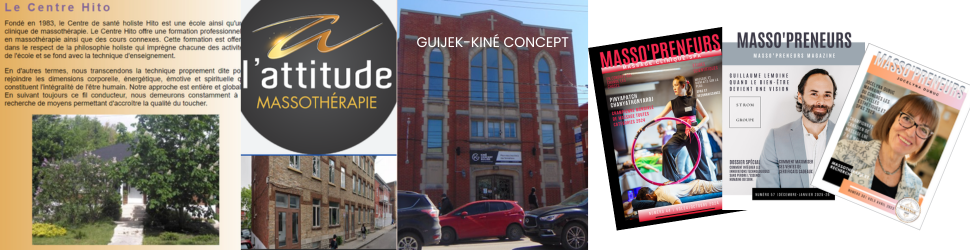 En 1987, l'Institut Kiné-Concept ( maintenant disparue ), a été fondée à Montréal, offrant un enseignement de qualité et perfectionnant continuellement ses programmes et méthodes pédagogiques. L'institut est devenue au cours des ans l'école principale dans le domaine à Montréal, elle a également contribué activement au développement du marché du travail, créant des débouchés prometteurs pour ses étudiants et diplômés. L’école GuiJeck fondée en (1981) : avait pour objectif de former une communauté d'apprentissage alliant techniques thérapeutiques et développement personnel, marquant la reconnaissance de la massothérapie au Québec.Un de ses fondateurs Jean-Marc girard poursuit sa mission en donnant des formations en youcher thérapeutique.
