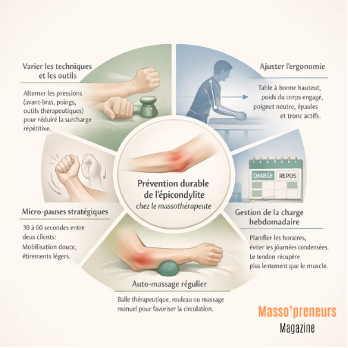 Les gestes répétitifs, la pression soutenue, les prises statiques prolongées et le volume horaire élevé exposent les massothérapeutes à une surcharge des muscles extenseurs de l’avant-bras.