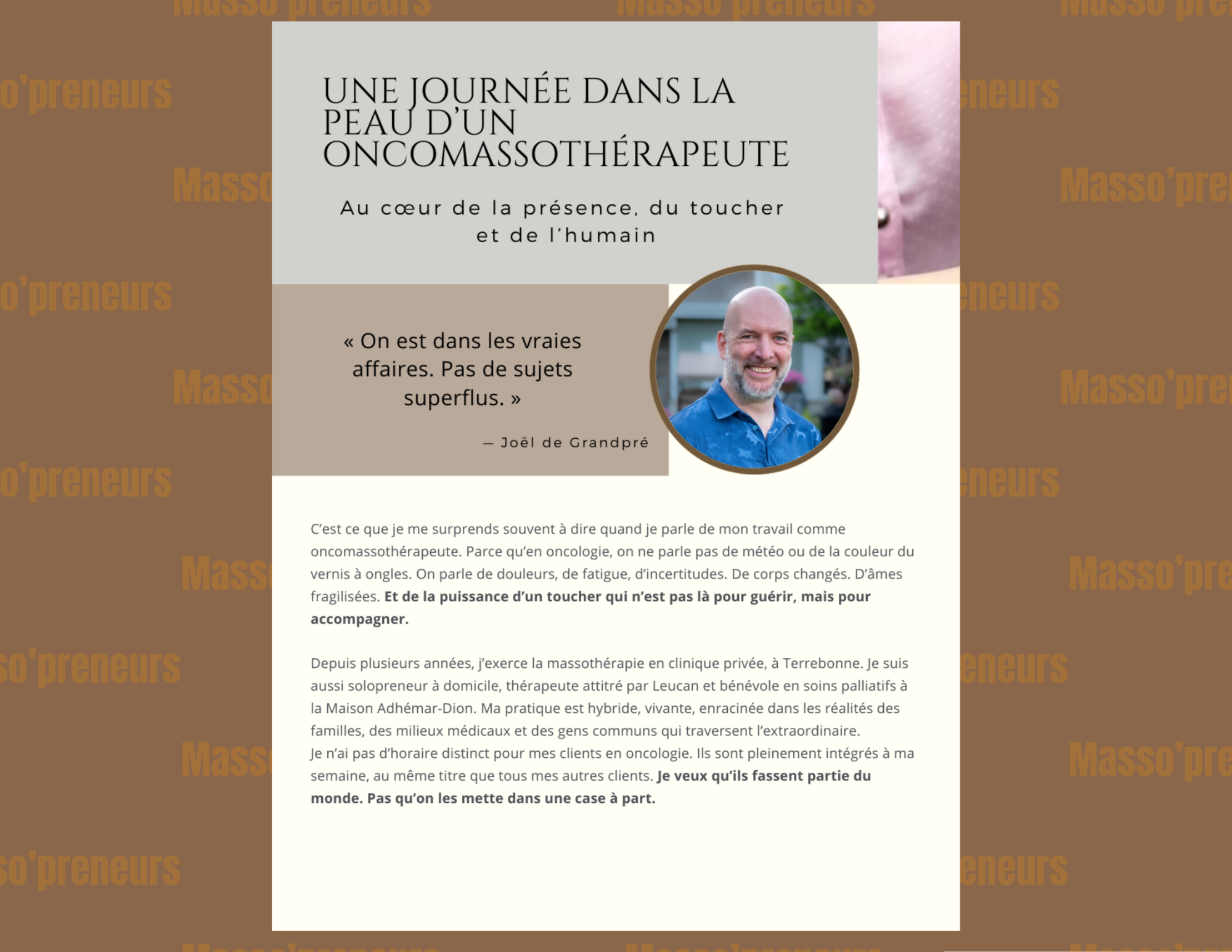 Et je les masse. Comme ils sont. Avec tout ce que ça implique. Des sondes, des connecteurs, des cicatrices, des stomies. Des corps chamboulés. Des esprits qui doutent. Et souvent… un besoin urgent de retrouver un espace de sérénité. Je masse aussi les proches aidants. Ceux qui portent, ceux qui s’effacent, ceux qui s’oublient. Ceux pour qui une séance est un petit moment de répit, de souffle, de ré-enracinement. Et ça, c’est tout aussi essentiel. Parfois, ils en ont davantage besoin que la personne qu’ils accompagnent; mais ils craignent de prendre la place de quelqu’un d’autre, comme si leur dévouement n’était pas digne, reconnu, comme s’il était normal.