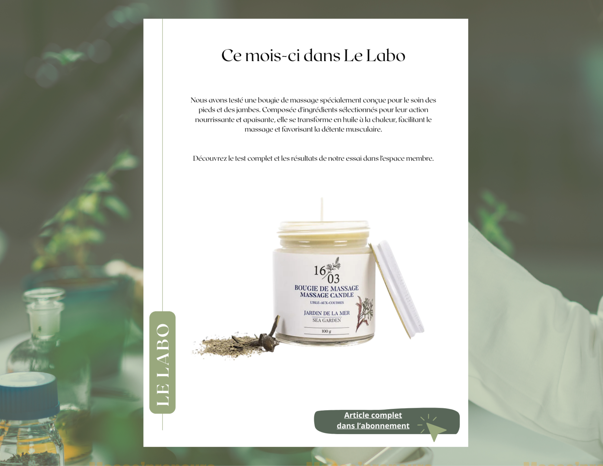 Nous avons testé une bougie de massage spécialement conçue pour le soin des pieds et des jambes. Composée d'ingrédients sélectionnés pour leur action nourrissante et apaisante, elle se transforme en huile à la chaleur, facilitant le massage et favorisant la détente musculaire.