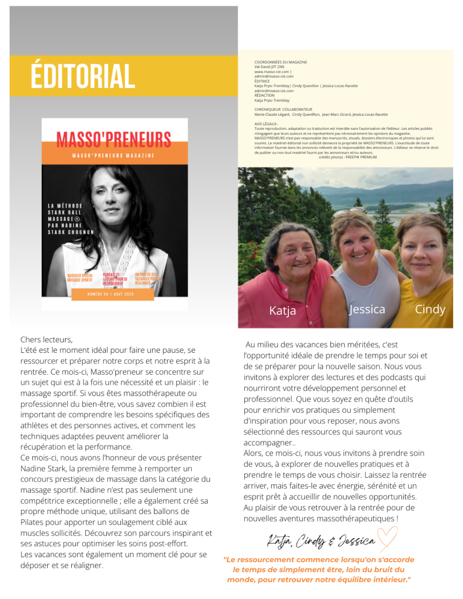 J'ai eu la chance de rencontrer Nadine Stark Chognon lors du championnat de massage du Canada, alors qu'elle était juge. Lorsque l'idée d'écrire un numéro sur le massage sportif a émergé, il était évident que Nadine serait la personne à interviewer. Son parcours impressionnant dans le domaine du bien-être parle de lui-même. Bonne lecture ! Par: Cindy Quevillon