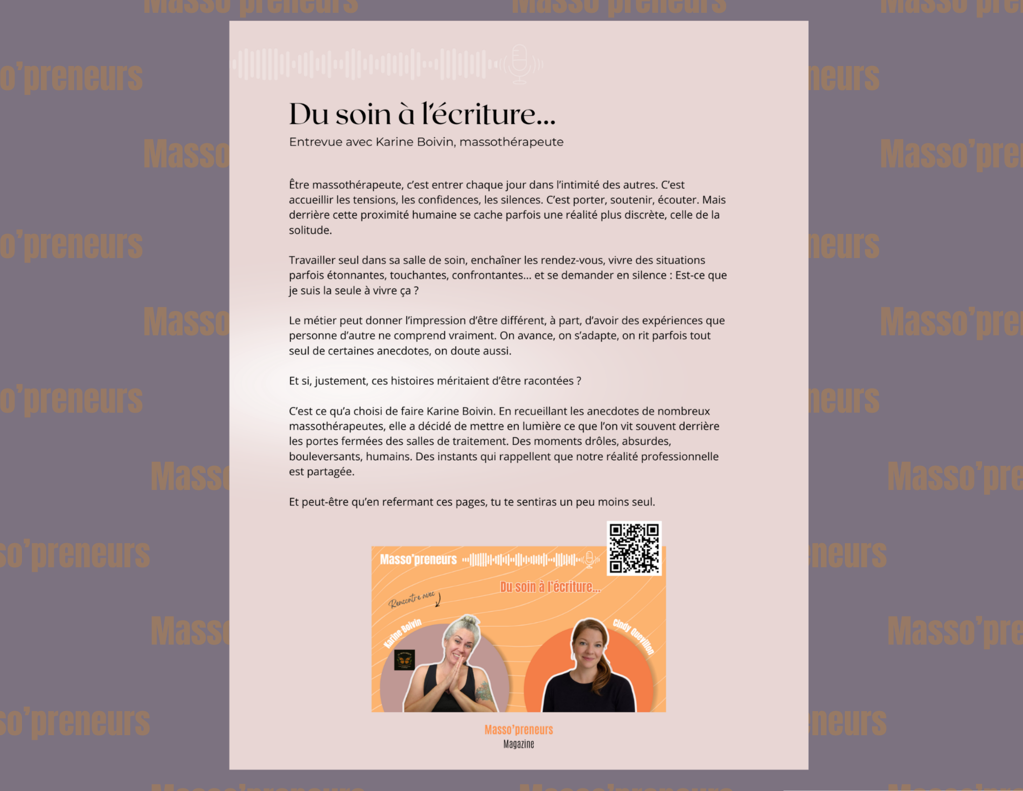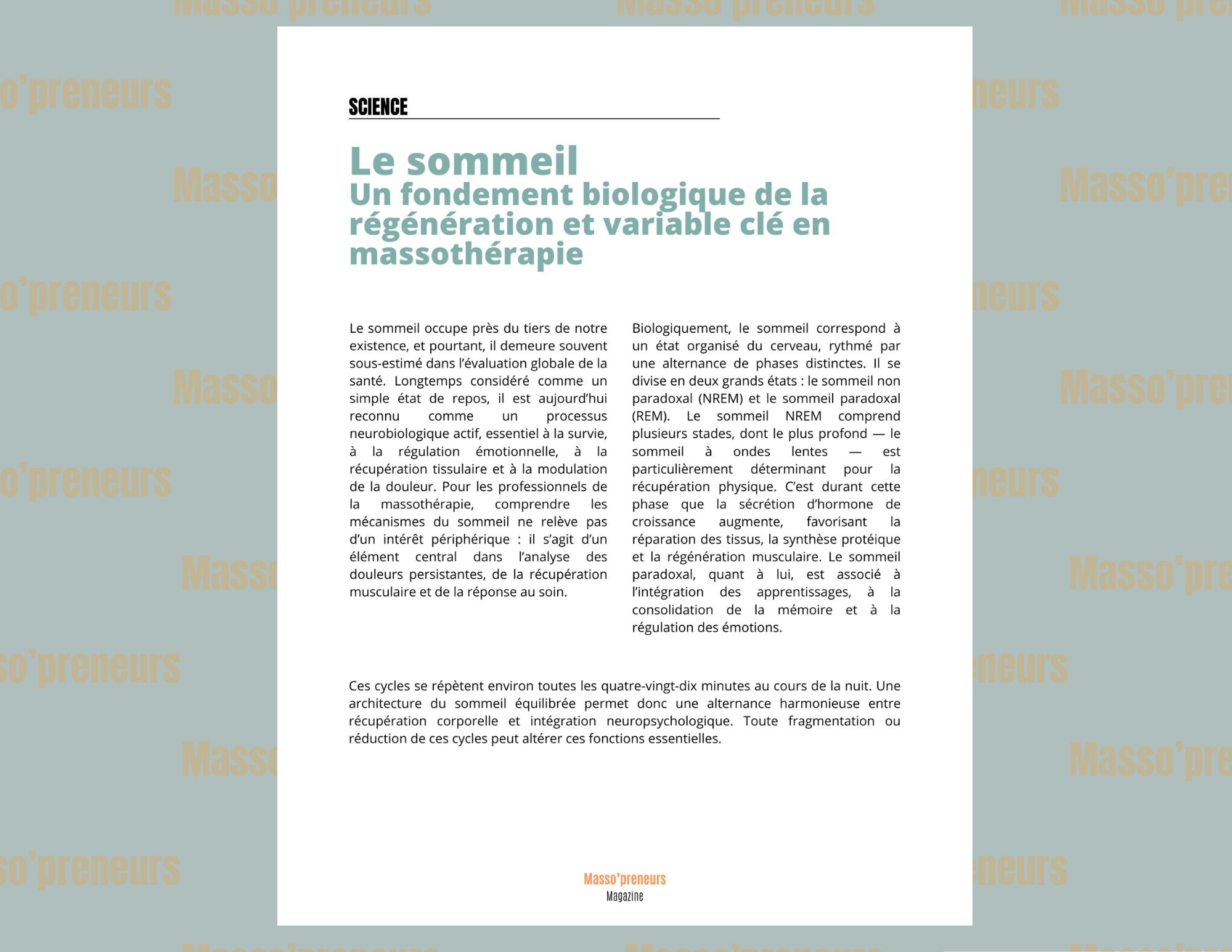 Plus qu’un magazine, Masso’preneurs est une communauté engagée à faire rayonner notre mission commune : le bien-être, l’expertise et l’évolution de la profession.